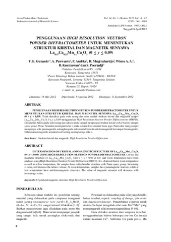 PENGGUNAAN HIGH RESOLUTION NEUTRON POWDER DIFFRACTOMETER UNTUK MENENTUKAN STRUKTUR KRISTAL DAN MAGNETIK SENYAWA LA0,47CA0,53MN1-YCUYO3 (0 Y 0,09).pdf - Published Version