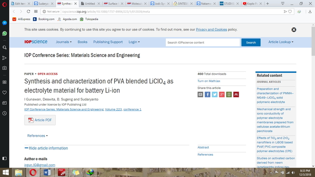 Gunawan, I and Deswita, Deswita and Sugeng, B. and Sudaryanto, Sudaryanto (2017) Synthesis and characterization of PVA blended LiClO4 as electrolyte material for battery Li-ion. In: IOP Conference Series: Materials Science and Engineering.