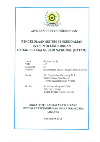 Inspektorat, INSP (2018) Laporan Proyek Perubahan Pengelolaan Sistem Pengendalian Intern Di Lingkungan Badan Tenaga Nuklir Nasional (BATAN). Project Report. Inspektorat, Jakarta. (Unpublished)