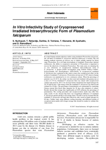 Siti, Nurhayati and Tur, Rahardjo and Darlina, Darlina and Devita, Tetriana (2017) In Vitro Infectivity Study of Cryopreserved Irradiated Intraerythrocytic Form of Plasmodium falciparum. Atom Indonesia, 43 (3). pp. 167-171. ISSN 0126-1568
