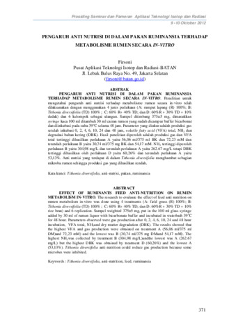 dedak) dan 6 kelompok sebagai ulangan. Sampel ditimbang 375±5 mg, dimasukkan syringe kaca 100 ml ditambah 30 ml cairan rumen yang sudah dicampur buffer bicarbonat dan diinkubasi pada suhu 39oC selama 48 jam. Parameter yang diukur adalah produksi gas setelah inkubasi 0, 2, 4, 6, 10, 24 dan 48 jam, volatile fatty acid (VFA) total, NH3 dan degradasi bahan kering (DBK). Hasil penelitian diperoleh adalah produksi gas dan VFA total tertinggi dihasilkan perlakuan A yaitu 56,06 ml/375 ml BK dan 72,23 mM dan terendah perlakuan B yaitu 30,74 ml/375 mg BK dan 54,17 mM. NH3 tertinggi diperoleh perlakuan B yaitu 304,98 mg/L dan terendah perlakuan A yaitu 262.67 mg/L tetapi DBK tertinggi dihasilkan oleh perlakuan D yaitu 60,26% dan terendah perlakuan A yaitu 53,13%. Anti nutrisi yang terdapat di dalam Tithonia diversifolia menghambat sebagian mikroba rumen sehingga produksi gas yang dihasilkan rendah.