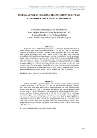 Rasyid Syahputra, Akhmad and Suhartini, Meri (2012) PENINGKAT INDEKS VISKOSITAS PELUMAS MESIN BERAT DARI KOPOLIMER LATEKS KARET ALAM-STIRENA. In: Prosiding Seminar dan Pameran Teknologi Aplikasi Teknologi Isotop dan Radiasi.