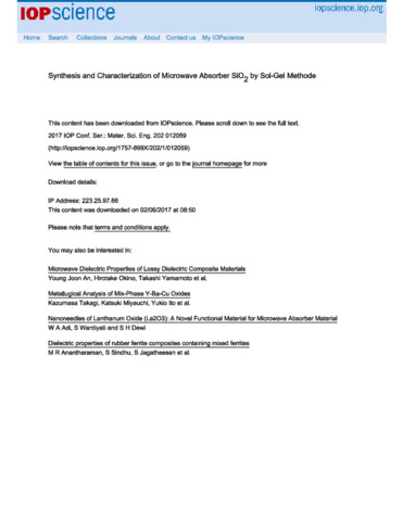 Wardiyati, Siti and Adi, Wisnu Ari and Deswita, Deswita (2017) Synthesis and Characterization of Microwave Absrorber SiO2 by Sol-Gel Methode. In: The 4th International Conference on Advanced Materials Science and Technology, 27–28 September 2016, Universitas Negeri Malang, Indonesia.