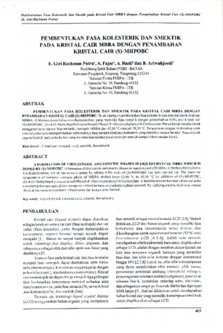 Putra, Edy Giri Rachman and Fajar, Andika and Rusli, A and Ariwahjoedi, Bambang (2004) Pembentukan Fasa Kolesterik dan Smektik pada Kristal Cair MBBA dengan Penambahan Kristal Cair (S)-MHPOBC. In: Pertemuan IImiah IImu Pengetahuan dan Teknologi Bahan 2004, 7 September 2004, Serpong.