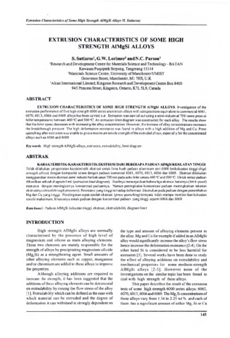 Sutiarso, Sutiarso and Lorimer, G.W and Parson, N.C (2004) EXTRUSION CHARACTERISTICS OF SOME HIGH STRENGTH AIMgSi ALLOYS. In: Pertemuan IImiah IImu Pengetahuan dan Teknologi Bahan 2004, 7 September 2004, Serpong.