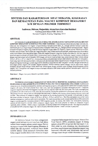 Sudirman, Sudirman and Ridwan, Ridwan and Mujamilah, Mujamilah and Karo Karo, Aloma and Rukihati, Rukihati (2004) Sintesis dan Karakterisasi Sifat Mekanik, Kekerasan dan Kemagnetan pada Magnet Komposit Heksaferit SrM dengan polimer Termoset. In: Pertemuan IImiah IImu Pengetahuan dan Teknologi Bahan 2004, 7 September 2004, Serpong.
