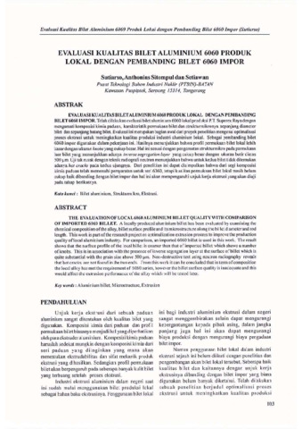 Sutiarso, Sutiarso and Sitompul, Anthonius and Setiawan, Setiawan (2008) EVALUASI KUALITAS BILET ALUMINIUM 6060 PRODUK LOKAL DENGAN PEMBANDING BILET 6060 IMPOR. In: Pertemuan Ilmiah Iptek Bahan 2008, 4 November 2008, Gedung DRN, Kawasan Puspiptek, Serpong.