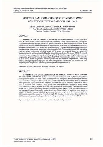 Gunawan, Indra and Deswita, Deswita and Karo Karo, Aloma and Sudirman, Sudirman (2008) Sintesis dan Karakterisasi Komposit High Density Polyethylene-Pati Tapioka. In: Pertemuan Ilmiah Iptek Bahan 2008, 4 November 2008, Gedung DRN, Kawasan Puspiptek, Serpong.