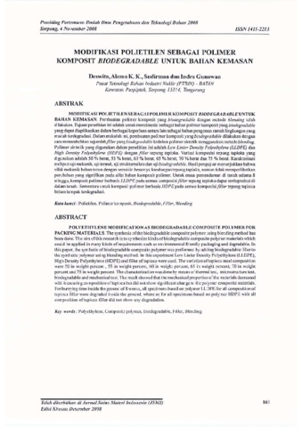 Deswita, Deswita and Karo Karo, Aloma and Sudirman, Sudirman and Gunawan, Indra (2008) Modifikasi Polietilen sebagai Polimer Komposit Biodegradable untuk Bahan Kemasan. In: Pertemuan Ilmiah Iptek Bahan 2008, 4 November 2008, Gedung DRN, Kawasan Puspiptek, Serpong.
