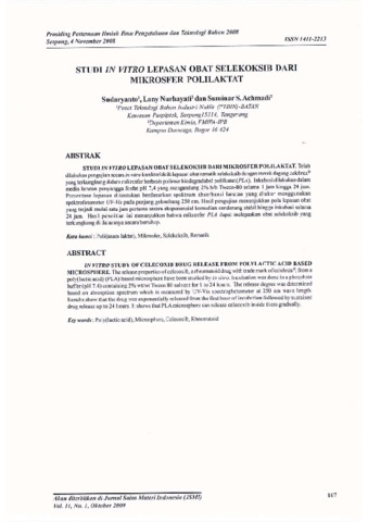 Sudaryanto, Sudaryanto and Nurhayati, Lany and Achmadi, Suminar S (2008) Studi in Vitro Lepasan Obat Selekosib dari Mikrosfer Polilaktat. In: Pertemuan Ilmiah Iptek Bahan 2008, 4 November 2008, Gedung DRN, Kawasan Puspiptek, Serpong.
