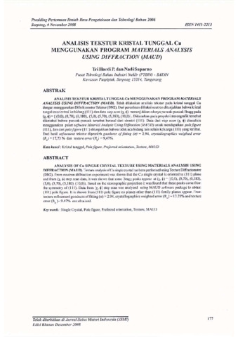 Priyanto, Tri Hardi and Suparno, Nadi (2008) Analisis Struktur Kristal Tunggal Cu menggunakan Program Materials Analysis Using diffraction (MAUD). In: Pertemuan Ilmiah Iptek Bahan 2008, 4 November 2008, Gedung DRN, Kawasan Puspiptek, Serpong.