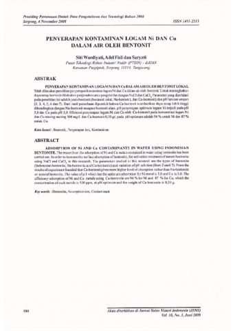 Wardiyati, Siti and Fisli, Adel and Saryati, Saryati (2008) Penyerapan Kontaminan Logam Ni dan Cu dalam Air oleh Bentonit. In: Pertemuan Ilmiah Iptek Bahan 2008, 4 November 2008, Gedung DRN, Kawasan Puspiptek, Serpong.