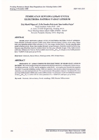 Wigayati, Etty Marti and Febrianto, Erfin Yundra and Fajar, Andika (2008) Pembuatan Senyawa LiMnO untuk Elektroda Baterai Padat Lithium. In: Pertemuan Ilmiah Iptek Bahan 2008, 4 November 2008, Gedung DRN, Kawasan Puspiptek, Serpong.