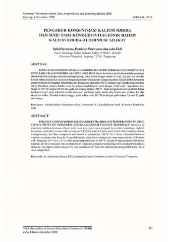 Purnama, Safei and Purwanto, Patricius and Fisli, Adel (2008) Pengaruh Konsentrasi Kalium Iodida dan Suhu pada Konduktivitas Ionik Bahan Kalium Iodida-Aluminium Silikat. In: Pertemuan Ilmiah Iptek Bahan 2008, 4 November 2008, Gedung DRN, Kawasan Puspiptek, Serpong.