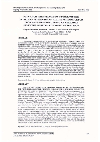 Sukirman, Engkir and Purwamargapratala, Yustinus and Adi, Wisnu Ari and Winatapura, Didin S (2008) Pengaruh Prekursor Non Stokiometris terhadap Pembentukan Fasa Superkonduktor YBCO dan Pengaruh Doping Ca terhadap Struktur Kristal Superkonduktor YBCO. In: Pertemuan Ilmiah Iptek Bahan 2008, 4 November 2008, Gedung DRN, Kawasan Puspiptek, Serpong.