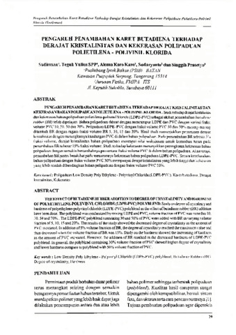 Sudirman, Sudirman and Panca Putra, Teguh Yulius Surya and Karo Karo, Aloma and Sudaryanto, Sudaryanto and Prasetyo, Singgih (2003) Pengaruh Penambahan Karet Butadiena terhadap Derajat Kristalinitas dan Kekerasan Polipaduan Polietilena-Polivinil Klorida. In: Simposium Nasional Polimer IV, 8 Juli 2003, Jakarta.