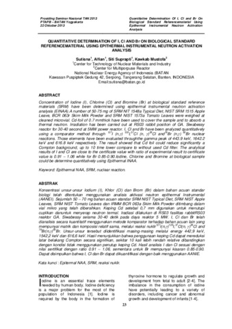 Sutisna, Sutisna and Alfian, Alfian and Suprapti, Siti and Mustofa, Kawkab (2013) QUANTITATIVE DETERMINATION OF I, Cl AND Br ON BIOLOGICAL STANDARD REFERENCEMATERIAL USING EPITHERMAL INSTRUMENTAL NEUTRON ACTIVATION ANALYSIS. In: Seminar Nasional Teknik Analisis Nuklir 2013, 22 Oktober 2013, Yogyakarta.