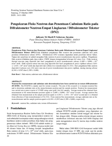Juliyani, Juliyani and Priyanto, Tri Hardi and Setiawan, Setiawan and Suyatno, Suyatno (2009) Pengukuran Fluks Neutron dan Penentuan Cadmium Ratio pada Difraktometer Neutron Empat Lingkaran / Difraktometer Tekstur (DN2). In: Seminar Nasional Hamburan Neutron dan Sinar X ke 7, 27 Oktober 2009, Serpong.