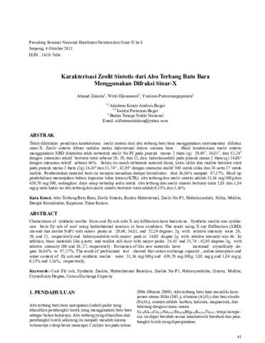 Zakaria, Ahmad and Djasmasari, Wittri and Purwamargapratala, Yustinus (2011) Karakterisasi Zeolit Sintetis dari Abu Terbang Batu Bara Menggunakan Difraksi Sinar-X. In: Seminar Nasional Hamburan Neutron dan Sinar X ke 8, 4 Oktober 2011, Serpong.