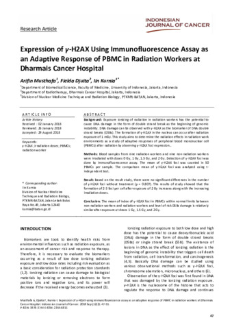 Iin, Kurnia (2018) Expression of γ-H2AX Using Immunofluorescence Assay as an Adaptive Response of PBMC in Radiation Workers at Dharmais Cancer Hospital. Indonesian Journal of Cancer, 12 (2). pp. 47-51. ISSN 2355-6811