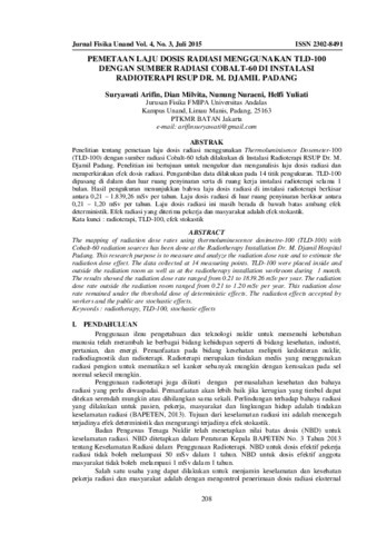 Nunung, Nuraeni (2015) PEMETAAN LAJU DOSIS RADIASI MENGGUNAKAN TLD-100 DENGAN SUMBER RADIASI COBALT-60 DI INSTALASI RADIOTERAPI RSUP DR. M. DJAMIL PADANG. Jurnal Fisika Unand, 4 (3). pp. 208-211. ISSN 2302-8491