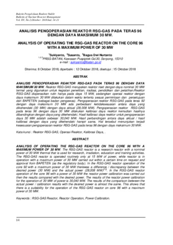 ANALISIS PENGOPERASIAN REAKTOR RSG-GAS PADA TERAS 96 DENGAN DAYA MAKSIMUM 30 MW. Reaktor RSG-GAS merupakan reaktor riset dengan daya nominal 30 MW termal yang digunakan untuk kegiatan penelitian, iradiasi, pendidikan dan pelatihan.Reaktor RSG-GAS dioperasikan rutin hanya pada daya 15 MW, sedangkan operasi reaktor dengan daya maksimum 30 MW dilakukan dalam waktu tertentu sesuai permintaan dan persetujuan dari BAPETEN (sebagai badan pengawas). Pengoperasian reaktor RSG-GAS pada teras 92 dengan daya maksimum 30 MW ada perbedaan/ ketidaksesuaian antara daya yang dikehendaki (30 MW) dengan daya aktual (28,008 MW). Pengoperasian reaktor RSG-GAS pada teras 96 dengan daya 30 MW dilakukan kalibrasi daya reaktor kemudian hasilnya dibandingkan dengan daya yang dikehendaki. Hasil kalibrasi daya reaktor untuk pengoperasian daya 30 MW adalah sebesar 30,040 MW. Hasil perbandingan antara daya aktual / hasil kalibrasi dengan daya yang dikehendaki hampir sama. Hal tersebut menunjukan terjadi kesesuaian pengoperasian reaktor RSG-GAS pada teras 96 dengan daya maksimum 30 MW.