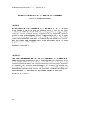 EVALUASI UNJUK KERJA DETEKTOR FLUKS NEUTRON JKT 02. JKT 02 adalah system pengukuran fluks netron untuk daya menengah, sistem ini terdiri dari dua sistem redudansi yaitu CX 811 dan CX821. Detektor dari system pengukuran ini menggunakan tipe compasated Ionzation chamber (CIC) yang meliputi 7 dekade ring pengukuran. Tujuan dari evaluasi ini adalah untuk mendapatkan informasi tentang unjuk kerja detector JKT 02 setelah beroperasi lebih dari sepuluh tahun. Data yang mendukung untuk digunakan sebagai bahan evaluasi trediri dari resistansi isolasi kabel, tes tegangan tinggi dan resistansi isolasi detektor. Dari hasil evaluasi dapat disimpulkan bahwa terjadi penyimpangan sebesar 99 %pada pengukuan resistansi kabel dan detektor.