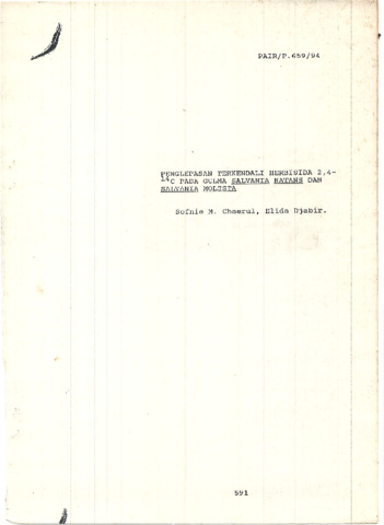 Chaerul, Sofni Marusin and Djabir, Elida (1994) Penglepasan Terkendali Herbisida 2,4-14C Pada Gulma Salvania Natans dan Salvania Molesta. Technical Report. PAIR BATAN, Jakarta.