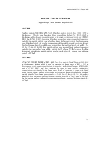 Analisis Limbah Cair RSG-GAS. Telah dilakukan Analisis Limbah Cair RSG –GAS ke Lingkungan. Metode yang digunakan dalam pengendalian limbah Cair RSG –GAS ke Lingkungan adalah dengan mencuplik sampel air di tangki penyimpanan limbah cair ( KPK01 BB01 dan KPK01 BB02), kemudian dilakukan pencacahan untuk mengetahui konsentrasi radioaktivitas nuklida-nuklida yang terkandung dalam limbah cair tersebut. Hasil pencacahan yang dilakukan limbah cair tersebut mengandung nuklida-nuklida produk korosi dan aktivasi. Hasil perhitungan diperoleh, nuklida yang teridentifikasi dari cuplikan limbah cair adalah : Co-60, Cs-137, Zn-65, Sb-124. Dari nuklida-nuklida yang teridentifikasi, terdapat konsentrasi radioaktivitas yang paling besar adalah nuklida Zn-65 sebesar 594 Bq/l, namun demikian konsentrasi radioaktivitas nuklida-nuklida tersebut masih dibawah batasan yang diijinkan yaitu, 2 x 103 Bq/l.