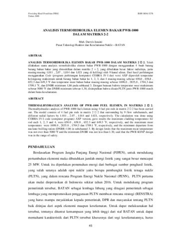 ANALISIS TERMOHIDROLIKA ELEMEN BAKAR PWR-1000 DALAM MATRIKS 2 2. Telah dilakukan suatu analysis termohidrolika elemen bakar PWR-1000 dengan menggunakan 4 buah batang batang bahan bakar yang dimodelkan dalam matriks 2 2, yang dibedakan besar faktor radialnya, yaitu masing-masing 1,011 , 2,07 , 1,014 dan 1,021 yang di kelilingi oleh 9 kanal aliran. Dari hasil perhitungan menggunakan Code (program perhitungan komputer) COBRA IV-I dari versi AXP diperoleh temperatur kelongsong maksimum untuk batang bahan bakar ke 1, 2, 3, dan 4 masing-masing sebesar 650,0 , 658,8 , 652,3 dan 649,3 oF dan temperatur meat bahan bakar masing-masing sebesar 1698,0 , 2835,0 , 1704,3 dan 1709,1 oF, dan DNBR minimum 1,86 pada subkanal 3. Dengan batasan bahwa temperatur meat maksimum sebesar 5080 oF dan DNBR minimum sebesar 1,30, disimpulkan bahwa disain PLTN jenis PWR-1000 masih dalam batas keselamatan.
