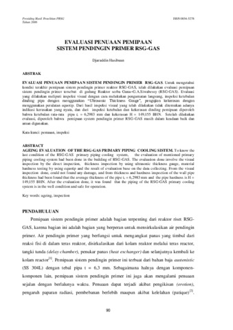 EVALUASI PENUAAN PEMIPAAN SISTEM PENDINGIN PRIMER RSG-GAS. Untuk mengetahui kondisi terakhir pemipaan sistem pendingin primer reaktor RSG-GAS, telah dilakukan evaluasi pemipaan sistem pendingin primer tersebut di gedung Reaktor serba Guna–G.A.Siwabessy (RSG-GAS). Evaluasi yang dilakukan meliputi inspeksi visual dengan cara melakukan pengamatan langsung, inspeksi ketebalan dinding pipa dengan menggunakan “Ultrasonic Thickness Gauge”, pengujian kekerasan dengan menggunakan peralatan equotip. Dari hasil inspeksi visual yang telah dilakukan tidak ditemukan adanya indikasi kerusakan yang nyata, dan dari inspeksi ketebalan dan kekerasan dinding pemipaan diperoleh bahwa ketebalan rata-rata pipa tr = 6,2983 mm dan kekerasan H = 149,155 BHN. Setelah dilakukan evaluasi, diperoleh bahwa pemipaan system pendingin primer RSG-GAS masih dalam keadaan baik dan aman digunakan.