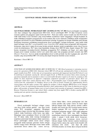 UJI FUNGSI DIESEL PEMBANGKIT BRV 20 DENGAN PLC S7 300 Diesel pembangkit merupakan catu daya cadangan bagi pengoperasian RSG-GAS. Diesel pembangkit BRV 20 akan beroperasi secara otomatis apabila ada gangguan suplai listrik dari PLN . Pada saat reaktor operasi terjadi trip dari PLN diesel tidak tidak hidup secara outomatis yang menyebabkan terputusnya suplai tenggangan. Dengan kejadian itu maka dilakukan pengujian pengoperasian secara manual dan secara outomatis dilakukan untuk menghindari gangguan oleh karena itu perlu dilakukan penelusuran terhadap kegagalan ini dengan dilakukan pemeriksaan komponen komponen pendukung pengoperasian diesel pembangkit, terdapat komponen yang sudah tidak dapat berfungsi yaitu PLC ( programmable Logic Controller).PLC adalah sistem pengendali dari komponen-komponen yang ada di ruang diesel,yang berupa perintah eksekusi untuk menjalankan sistem diesel beserta sistem keselamatannya. PLC lama yang digunakan diruang diesel BRV20 harus diganti dengan PLC baru karena mengalami kerusakan.Setelah dilakukan penggantian PLC dilakukan uji fungsi start pada tahap dengan posisi manual menekan tombol start pada lokal panel dan pengujian perintah otomatis dari RPS (Reactor Protection System) untuk menghidupkan diesel seolah perintah trip dari tegangan jala- jala PLN terputus yang menyebabkan BRV 20 running dan dapat beroperasi kembali secara otomatis .