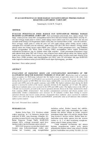 EVALUASI PEMANTAUAN DOSIS RADIASI DAN KONTAMINASI PEKERJA RADIASI REAKTOR GA.SIWABESSY TAHUN 2007. Hasil pemantauan penerimaan dosis radiasi dengan TLD badge selama perioda tahun 2007, menunjukkan bahwa Dosis Ekivalen Seluruh Tubuh (DEST) atau Hp 10 , rata-rata tertinggi terjadi pada tri wulan I, untuk bidang sistem reaktor yaitu 0,33 ± 0,29 mSv, dan rata rata terendah untuk bidang Unit Pengamanan Nuklir (UPN) dan Unit Jaminan Mutu (UJM) yaitu tak terdeteksi.. Dosis tertinggi, terjadi pada tri wulan III yaitu 3,57 mSv unuk pekerja radiasi bidang operasi reaktor, sedangkan dosis terendah yaitu tak terdeteksi, untuk bidang UPN dan UJM. Dosis tahunan tertinggi adalah pekerja radiasi dari bidang operasi reaktor PRSG yaitu 7,30 mSv .Untuk pemantauan dosis yang dilakukan dengan menggunakan alat Whole Body Counting (WBC) menunjukkan bahwa tingkat kontaminasi radionuklida hasilaktivasi dan fisi didalam tubuh tidak terdeteksi. Untuk pemantauan kontaminasi tinggi pada pakaian kerja tahun 2007 ada 34 kasus, yang sebagian besar adalah pekerja radiasi dari bidang operasi reaktor dan sistem Reaktor. Dosis personil yang diterima pekerja radiasi tersebut masih jauh dibawah Nilai Batas Dosis (NDB) pertahun yang diperkenankan oleh IAEA yaitu (20 mSv/tahun) dan juga BAPETEN maka tingkat keselamatan radiasi personil PRSG masih dapat dipertanggung jawabkan.