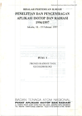 Syafalni, Syafalni and Satrio, Satrio and Indrojono, Indrojono and Darman, Darman (1997) Teknik Radioperunut Untuk Mempelajari Karakteristik Air tanah dangkal di PPTA Pasar Jumat. In: Risalah Pertemuan Ilimiah Penelitian Pengembangan dan Penelitian Aplikasi Isotop dan Radiasi 1997, 18-19 Februari 1997, jakarta.