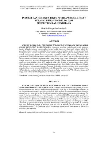 INDUKSI KANKER PADA TIKUS PUTIH SPRAGUE DAWLEY SEBAGAI HEWAN MODEL DALAM PENELITIAN RADIOFARMAKA. Umumnya, penelitian radiofarmaka untuk diagnosis kanker dilakukan dengan menggunakan hewan model khususnya tikus putih sebagai objek dari percobaan. Namun, untuk mendapatkan hewan model yang mengalami kanker terbilang relatif sulit. Berbagai metode untuk menciptakan hewan model seringkali belum optimal sehingga perlu dicari metode yang paling efektif dalam menginduksi terjadinya kanker pada hewan percobaan. Pada penelitian ini telah dilakukan induksi kanker melalui variasi dosis DMBA dan umur tikus putih Sprague Dawley untuk mendapatkan kejadian kanker yang paling tinggi, cepat, dan tingkat mortalitas yang rendah. Hasil dari penelitian menunjukkan bahwa peluang tertinggi kejadian kanker terjadi melalui pemberian dosis DMBA sebesar 17,5 mg/kg BB pada tikus berumur 4 minggu yaitu sebesar 100%. Waktu kejadian kanker paling cepat dihasilkan dari pemberian dosis DMBA sebesar 20 mg/kg BB pada tikus berumur 4 minggu yaitu selama 4,5 minggu. Sedangkan, tingkat mortalitas tikus yang diinduksi terjadi melalui pemberian dosis DMBA 25 mg/kg BB pada tikus yang berumur 4 minggu yaitu sebesar 75%. Selain itu, hasil uji tingkat afinitas sel kanker terhadap radiofarmaka 99mTc-Glutation juga relatif tinggi, yaitu sebesar 0,99% ID/g pada jam ke-3 pasca injeksi.
