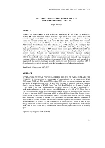 EVALUASI KONSUMSI DAYA LISTRIK RSG-GAS PADA SIKLUS OPERASI TERAS 58. Telah dilakukan evaluasi konsumsi daya listrik pada siklus operasi RSG-GAS teras 58 tanggal 12 Juli 2006 sampai dengan 07 Nopember 2006 menggunakan data rekening listrik dan laporan operasi RSG-GAS teras 58 tahun 2006. Berdasarkan hasil evaluasi konsumsi daya listrik, beban LWBP (Lewat Waktu Beban Puncak) pada akhir sebesar 12.861, WBP (Waktu Beban Puncak) pada akhir sebesar 2.481, kVAR sebesar 12.977 sedangkan daya yang dibangkitkan sampai akhir teras LVI sebesar 641,1361 MWD (Mega Watt Day) dengan daya operasi umumnya sebesar 15 MW dengan waktu siklus operasi RSG-GAS teras 58 ini, 46,92 % dari waktu yang tersedia digunakan untuk operasi reaktor, sedangkan 53,08 % kondisi reaktor padam. Kondisi ini dipergunakan untuk beberapa kegiatan meliputi pembongkaran/pembentukan teras, persiapan sarana operasi, perawatan sistem instrumentasi, elektrik dan mekanik serta perbaikan sistem instrumentasi dan mekanik yang mengalami gangguan. Sehingga dari keseluruhan waktu operasi, 99,86 % digunakan pada operasi daya tinggi untuk kegiatan iradiasi target produksi radioisotop dan eksperimen, sedangkan 0,14 % digunakan pada operasi daya rendah untuk kegiatan eksperimen fisika pada awal siklus.
