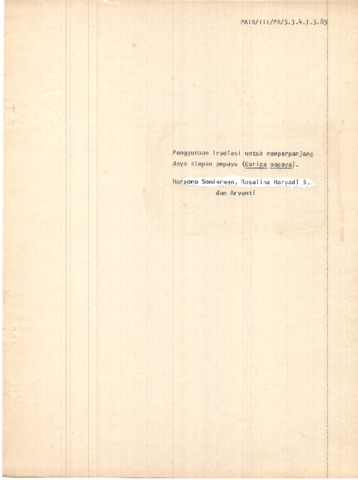 Soadarman, Harsono and Sinaga, Roaslina Hariyadi and Aryanti, Aryanti (1989) Penggunaan Iradiasi Untuk Memperpanjang Daya Simpan Pepaya (Carica Papaya). Technical Report. PAIR BATAN, Jakarta.