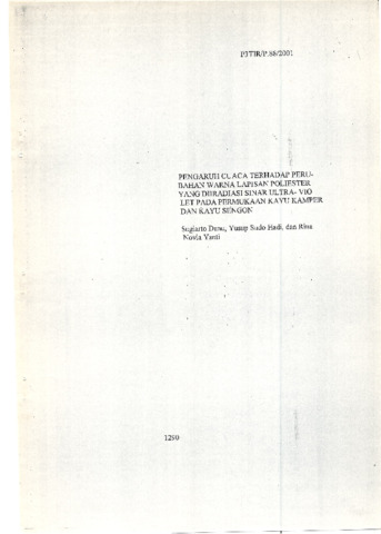 Danu, Sugiarto and Hadi, Yusuf (2001) Pengaruh Cuaca Terhadap Perubahan Warna Lapisan Poliester yang Diiradiasi Sinar Ultra-Violet pada permukaan kayu Kamper dan Kayu Sengon. Technical Report. PAIR BATAN, Jakarta.