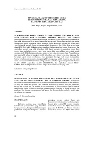 PENGEMBANGAN JALUR PENCUPLIK UDARA SISTEM PEMANTAU RADIASI BETA AEROSOL DAN ALPHA-BETA AEROSOL RSG-GAS. Telah dilakukan pengembangan sistem pemantau radiasi dengan melakukan perancangan dan pembuatan jalur pencuplik udara sistem beta aerosol dan alpha beta aerosol. Sistem Beta aerosol dan Alpha-Beta aerosol adalah merupakan sistem pengukur tingkat kosentrasi radionuklida dalam udara yang berbentuk aerosol. Sistem pemantau radiasi Beta aerosol dan Alpha-Beta aerosol yang ada di RSG-GAS telah dilakukan refungsionalisasi. Refungsionalisasi sistem Beta aerosol dan Alpha-Beta aerosol yang telah dilakukan tidak dapat langsung menggantikan sistem Beta aerosol dan Alpha-Beta aerosol yang lama karena jalur pencuplikan udara tidak sesuai, sehingga perlu dilakukan pengembangan atau renovasi pada sistem yang baru. Pengembangan jalur pencuplik udara ini menjadi mutlak dilakukan agar sistem baru dapat dipasang dan berfungsi seperti sistem sebelumnya. Hasil pengujian dari tiga buah sistem menunjukkan bahwa sebelum dan sesudah sistem pencuplik baru dipasang adalah besarnya laju alir udara sama. Hal ini membuktikan bahwa refungsionalisasi terhadap tiga sistem yaitu Beta Aerosol KLK06 CR003, Alpha-Beta KLK04 CR002/CR003, dan Alpha-Beta Aerosol KLK01 CR001/CR002 mendapatkan hasil sesuai dengan dasar operasi sistem yang baru.