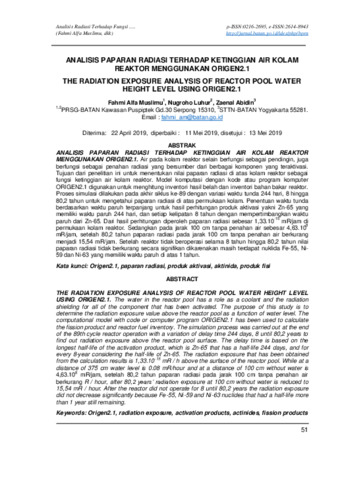 ANALISIS PAPARAN RADIASI TERHADAP KETINGGIAN AIR KOLAM REAKTOR MENGGUNAKAN ORIGEN2.1. Air pada kolam reaktor selain berfungsi sebagai pendingin, juga berfungsi sebagai penahan radiasi yang bersumber dari berbagai komponen yang teraktivasi. Tujuan dari penelitian ini untuk menentukan nilai paparan radiasi di atas kolam reaktor sebagai fungsi ketinggian air kolam reaktor. Model komputasi dengan kode atau program komputer ORIGEN2.1 digunakan untuk menghitung inventori hasil belah dan inventori bahan bakar reaktor. Proses simulasi dilakukan pada akhir siklus ke-89 dengan variasi waktu tunda 244 hari, 8 hingga 80,2 tahun untuk mengetahui paparan radiasi di atas permukaan kolam. Penentuan waktu tunda berdasarkan waktu paruh terpanjang untuk hasil perhitungan produk aktivasi yakni Zn-65 yang memiliki waktu paruh 244 hari, dan setiap kelipatan 8 tahun dengan mempertimbangkan waktu paruh dari Zn-65. Dari hasil perhitungan diperoleh paparan radiasi sebesar 1,33.10-15 mR/jam di permukaan kolam reaktor. Sedangkan pada jarak 100 cm tanpa penahan air sebesar 4,63.108 mR/jam, setelah 80,2 tahun paparan radiasi pada jarak 100 cm tanpa penahan air berkurang menjadi 15,54 mR/jam. Setelah reaktor tidak beroperasi selama 8 tahun hingga 80,2 tahun nilai paparan radiasi tidak berkurang secara signifikan dikarenakan masih terdapat nuklida Fe-55, Ni-59 dan Ni-63 yang memiliki waktu paruh di atas 1 tahun.