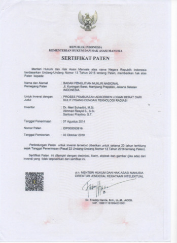 2018 1. Paten Granted Adsorben Logam Berat Meri Suhartini.pdf