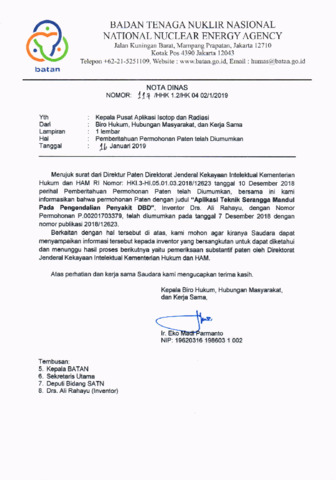 Merujuk surat dari Direktur Paten Direklorat Jenderal Kekayaan lntelektual Kementerian Hukum dan HAM Rl Nomor: HKl.3-H1.05.01.03.2018/'12623 tanggal 10 Desember 2018