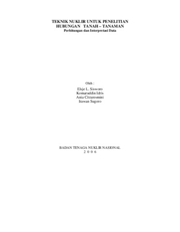 L. Sisworo, Elsje and Idris, Komaruddin and Citraresmini, Ania and Sugoro, Irawan (2006) TEKNIK NUKLIR UNTUK PENELITIAN HUBUNGAN TANAH – TANAMAN: Perhitungan dan Interpretasi Data. Badan Tenaga Nuklir Nasional, Jakarta.