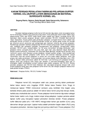 Rianto, Sugeng and Sarjono, Sarjono and Haryadi, Dedy and Husnurrofiq, Dedy and Sukarsono, Sukarsono (2018) KARAKTERISASI PERALATAN FABRIKASI PELAPISAN BUFFER KERNEL UO2 (BUFFER LAYER) MENGGUNAKAN MATERIAL SURROGATE KERNEL UO2. Hasil-Hasil Penelitian EBN Tahun 2018, - (-). pp. 6-26. ISSN 0854-5561