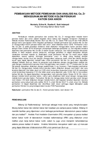 | Uncontrolled Keywords: | Pemisahan Nd; Ce dan Zr; Kolom penukar kation; Resin dowex I-X4 |