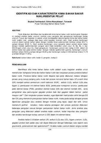 Boybul and Yanlinastuti and Erlina Noerpitasari and Torowati (2018) IDENTIFIKASI DAN KARAKTERISTIK KIMIA BAHAN BAKAR NUKLIRBENTUK PELAT. Hasil-Hasil Penelitian EBN Tahun 2018, - (-). pp. 106-113. ISSN 0854-5561