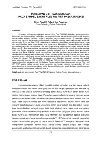 Helmi Fauzi Rahmatullah and Refa Artika and Purwanta (2018) PERSIAPAN UJI TIDAK MERUSAK PADA SAMPEL SHORT FUEL PIN PWR PASCA IRADIASI. Hasil-Hasil Penelitian EBN Tahun 2018, - (-). pp. 172-185. ISSN 0854-5561