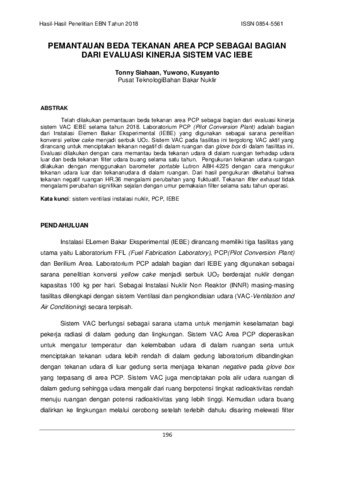 Siahaan, Tonny and Yuwono, Yuwono and Kusyanto, Kusyanto (2018) PEMANTAUAN BEDA TEKANAN AREA PCP SEBAGAI BAGIAN DARI EVALUASI KINERJA SISTEM VAC IEBE. Hasil-Hasil Penelitian EBN Tahun 2018, - (-). pp. 196-202. ISSN 0854-5561