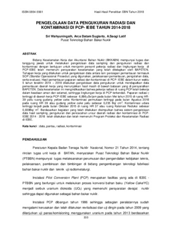 Wahyuningsih, Sri and Sugiarto, Arca Datam and Saogi Latif, Akhmad (2018) PENGELOLAAN DATA PENGUKURAN RADIASI DAN KONTAMINASI DI PCP- IEBE TAHUN 2014-2018. Hasil-Hasil Penelitian EBN Tahun 2018, - (-). pp. 333-347. ISSN 0854-5561