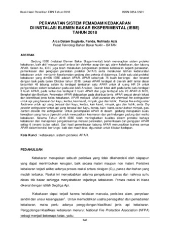 Sugiarto, Arca Datam and Farida, Farida and Aziz, Nofriady (2018) PERAWATAN SISTEM PEMADAM KEBAKARAN DI INSTALASI ELEMEN BAKAR EKSPERIMENTAL (IEBE) TAHUN 2018. Hasil-Hasil Penelitian EBN Tahun 2018, - (-). pp. 348-357. ISSN 0854-5561